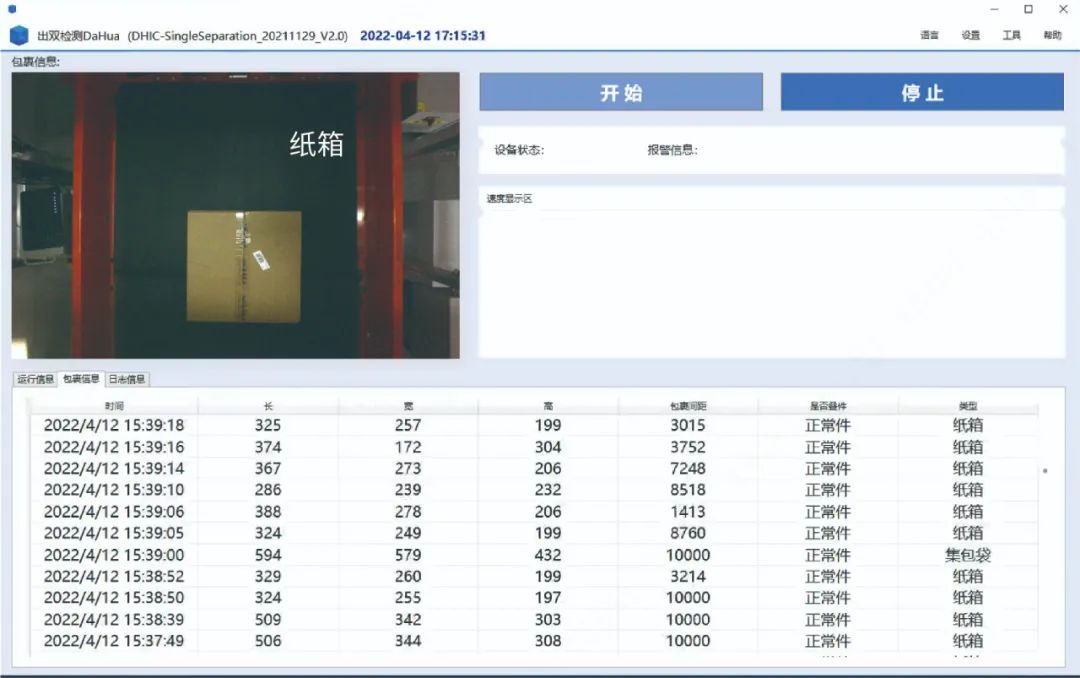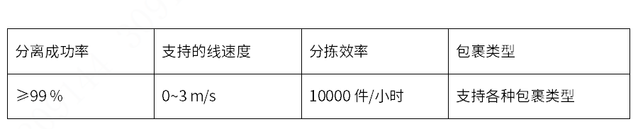 单件分离器,通过双目相机采集视野内包裹3D点云数据,输出各个包裹方位信息。再根据各个包裹的位置关系,由速度算子控制不同输送皮带线运行速度,从而形成速度差来实现包裹分离。