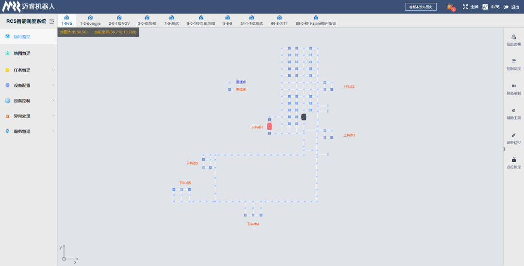 RCS v2.0采用迈睿多种先进算法,建立智能仓储机器人的“世界地图”,将仓储地图转换成AGV能够识别的模型数据,从而实现任务的最优分配、路径的最优规划以及机器人自主充电、规避障碍物等功能,使系统能发挥其最佳的工作效能。
