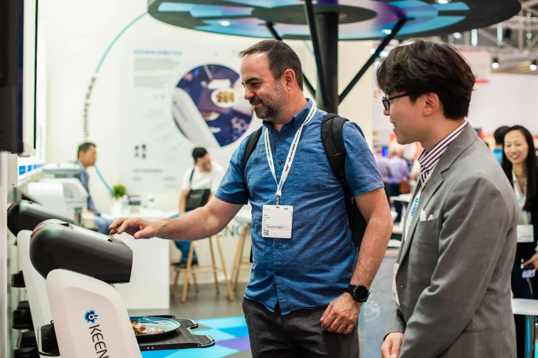 慕尼黑Automatica展会已经成为世界上工业自动化领域规模最大、最重要、知名度最高的机器人及自动化技术博览会。时隔四年,Automatica 2022再次线下举办,来自全球的近六百家企业齐聚automatica 2022,包含ABB、发那科、西门子、库卡等知名机器人企业,共同探讨机器人和自动化产业发展的最新趋势。在本次展会中,擎朗智能主要展示送餐机器人T5、T6、飞鱼,酒店机器人W3以及消毒机器人M2等多款产品,通过丰富的产品矩阵和多样的自动化解决方案,展现出擎朗智能的综合实力,吸引现场观众纷纷围观驻足。
