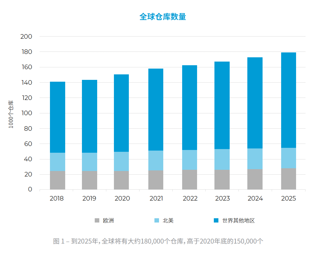 据Interact Analysis数据统计,截至2020年底,全球共有15万个仓库。而到2025年,这一数字将增长到约18万。仓储自动化未来市场潜力巨大,不仅仅是因为电子商务的发展进一步推动了仓库数量的激增,目前75%的仓库还有待自动化也证实了该领域的蓝海市场潜力。