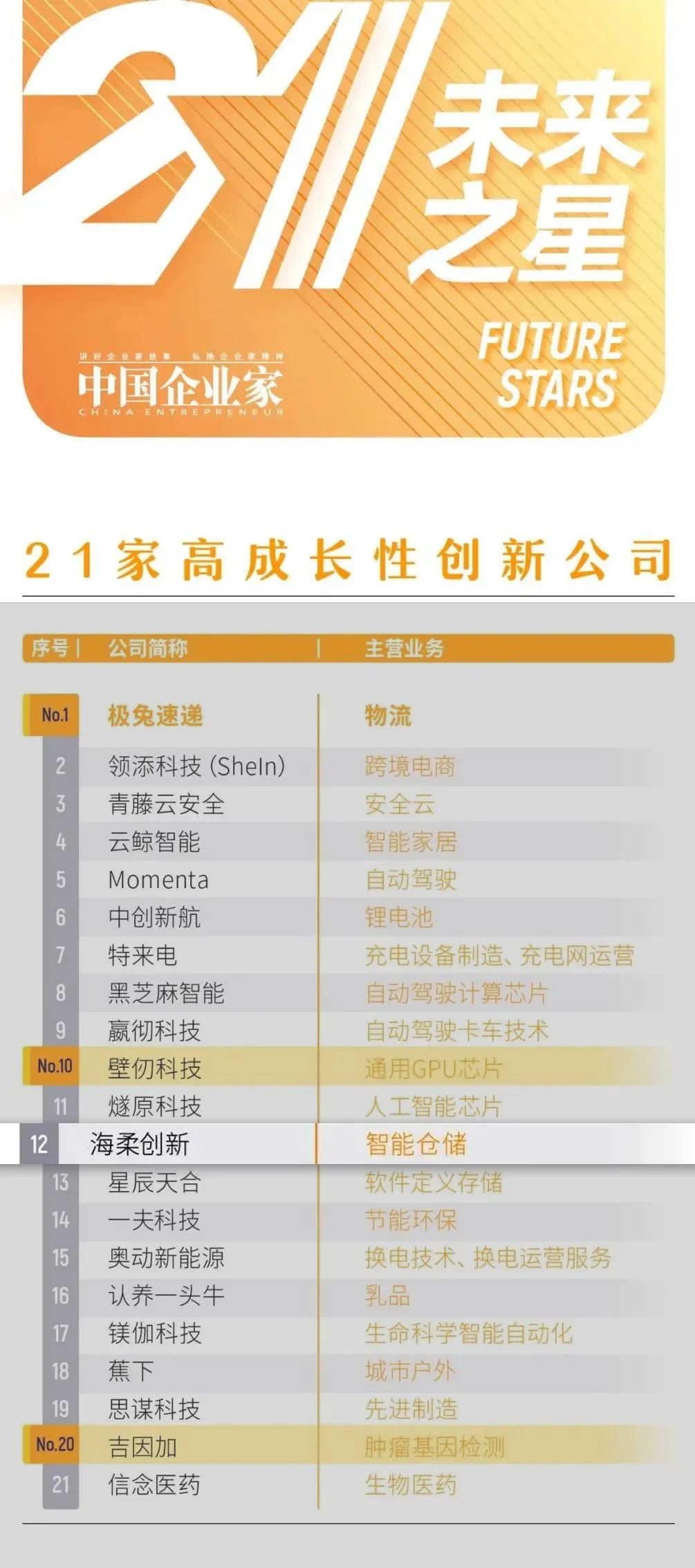 本周,海柔创新入选由《中国企业家》评选的“未来之星”——年度21家高成长性创新公司,也是唯一一家入选该榜单的智能仓储企业。