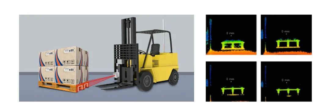 依靠维感科技推出的工业级3D ToF深度相机进行托盘图像采集,结合相应图像处理算法对叉车货物托盘进行识别,并得到其位置与姿态坐标,智能调整进叉方向从而实现无人化智能托盘搬运,解决无人叉车对接托盘位置偏移角度较大的问题。同时,结合人工智能算法对托盘识别模型进行强化训练和深度学习,提升其识别叉车货物托盘与跟踪的准确性。