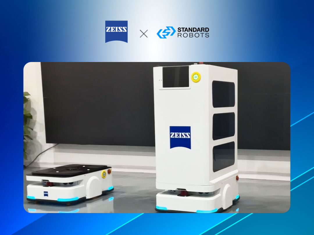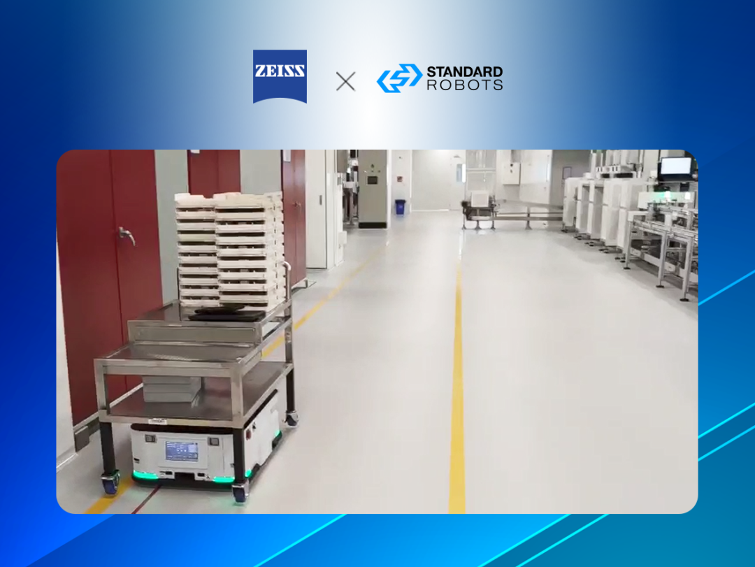 斯坦德机器人与卡尔蔡司光学科技(广州)有限公司自2019年开始合作,目前已完成三期项目部署,共计近30台 AMR 在蔡司的智能工厂运行,涉及原材料周转、车间产线配送、成品物料搬运。