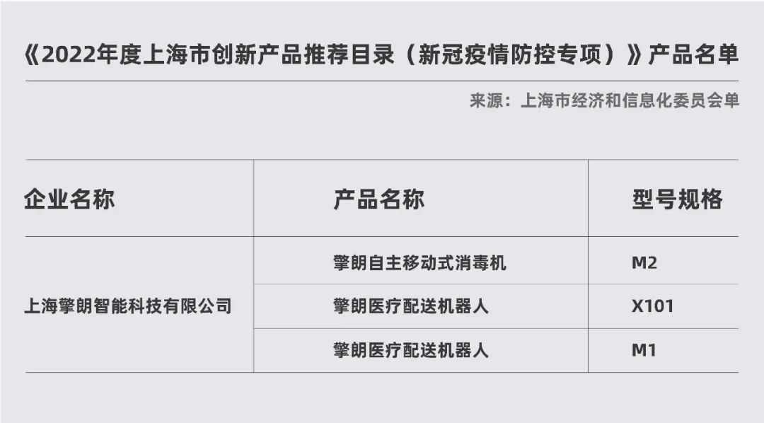 同时,擎朗医疗X101、M1以及M2系列入选《2022年度上海市创新产品推荐目录(新冠疫情防控专项)》产品名单,获得了上海市经济和信息化委员会的表彰认可。