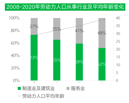 供给侧是关于员工侧的问题,主要在于『人口老龄化+人工成本的持续攀升』,使得汽车生产面临了招工难的困境。从下图中可以发现,从事制造产业的年轻劳动力比重正在逐渐降低,现在的年轻人已经不再倾向于进入工厂和物流产业。长此以往,『用工荒』这一情况将有很大概率在汽车生产厂家中出现。