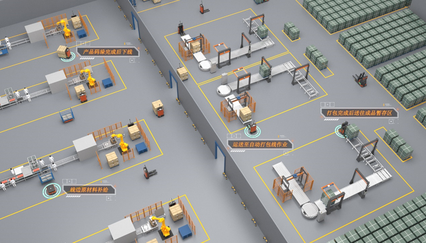 产线末端的成品码垛、包装、装车无人一体化盒子:针对产线末端,提炼出包括AGV/AMR与码垛机,包装线,无人化装车等一体化方案,标准的配置,灌装整个系统,形成标准化方案。