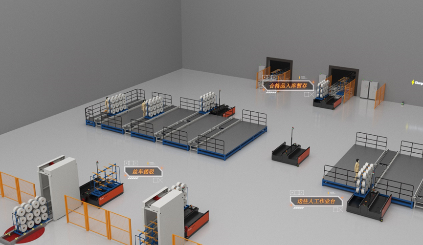 玻化纺行业丝车后道工序无人化转运盒子:针对玻化纺行业的丝车最后一道工序的转运过程的多人工场景,通过独创的双工位的移动机器人实现长物料的无人化转运,大大提升智能化程度。