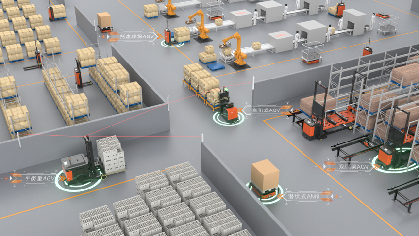产线边多设备大规模混合调度无人化配送盒子:融合5G等技术的AGV、AMR产品的多种移动机器人集中部署,链接堆垛机、输送线、包装线,电梯和升降机等一体化场景。