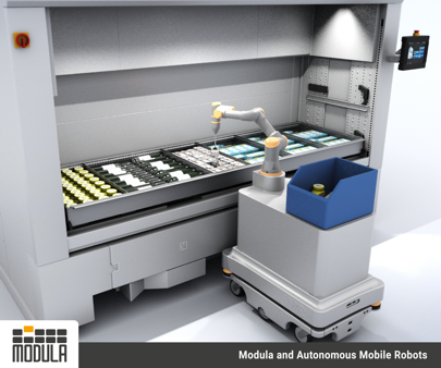 凭借卓越的软件系统,MiR AMR 与 Modula 的存储单元密切集成,可以保证机器人精准运行、多机协同,并且和人安全共存,做到技能互补。此外,MiR 还可通过顶部模块,完成“手脚眼”并用的物流功能,突破传统物流机器人的功能限制,帮助客户释放更多人力、节约更多生产时间,提高成品处理效率,简化质检样品的拣选和运输,优化包装材料的最后一公里运输。