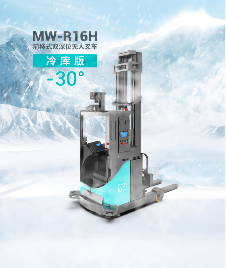 在 2022广州物流展上,劢微机器人重磅推出适用于冷库的无人叉车解决方案,并发布第一款冷库应用新品-冷库版前移式无人叉车MW-R16H,可满足零下30°低温环境搬运需求。