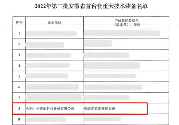 2022年度安徽省首台套重大技术装备名单(第二批)在安徽省经信厅网站公示。经主管部门审核、机构专家评审,合肥井松智能科技股份有限公司(以下简称:井松智能)自主研发的“智能高架库管理系统”凭借其先进的技术通过认定,获得“安徽省首台套重大技术装备”荣誉称号。