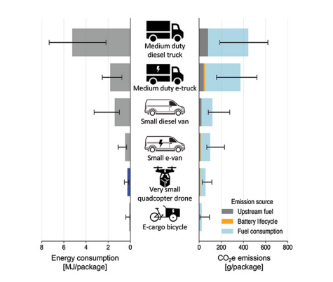 通过能源消耗和二氧化碳排放对最后一公里交付模式的比较表明,非常小的四轴无人机和电动货运自行车效率最高。资源: 工程学院