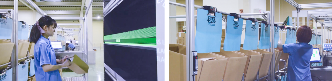海康机器人系统与PPS和SAS无缝对接,PPS通过投影的方式照亮需上架和下架的货的仓位,具备放错报警机制,SAS增加开门动作,有效防呆,防止人工投错,提升拣选正确率至近100%。