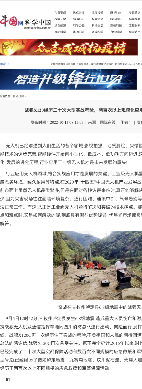 据不完全统计,2015年以来,时代星光生产的战狼X120无人机已经完成了二十次大型实战保障活动和数百次不同规模的应急救援和军警保障活动,仅战狼X120这一款型号,就已经经历了诸如泸定地震、九寨沟地震、汶川泥石流、天津大爆炸等二十次大型实战活动,另外经历了两百次以上不同规模的应急救援和军警保障活动!
