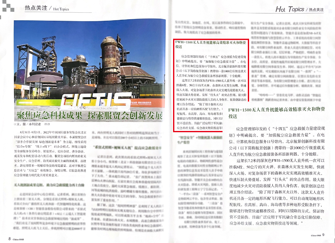 航景创新于2022年中国国际服务贸易交易会上进行了丰富的产品展示,FWH-1500型无人直升机在现场收到众多访客的关注,同时也得到了多方媒体与业内人士的青睐。以下是《中国安全生产》杂志服贸会主题中对航景创新产品的报道: