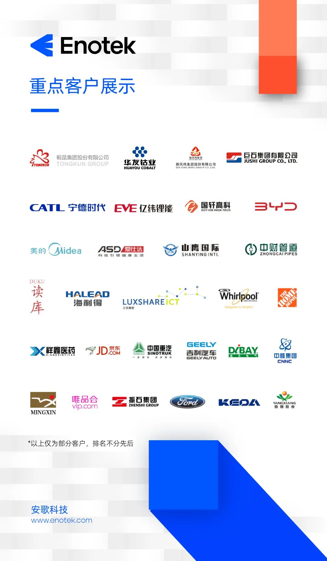 安歌科技Enotek是一家以创新驱动的全链路工业智能物流解决方案提供商,公司成立于2008年,全球总部位于上海,在国内拥有3处研发中心及生产基地,在美国设有子公司,业务遍及全球20+国家及地区。 安歌科技拥有软著53项、发明专利 133项、累计专利 440 项,也是国内率先开发出智能物流数字孪生系统的企业之一。秉承着“以创新,致未来”的理念,安歌科技凭借卓越的创新力、服务力、交付力为桐昆股份、中国巨石、中国重汽、国轩高科、比亚迪等全球范围内的企业提供服务,已经帮助客户落地的智能物流项目超过100个,项目覆盖化纤、新能源、新材料、汽车零配件、造纸、电子电器、食品饮料等众多行业。 安歌科技为客户提供涵盖“设备+软件+系统+平台服务”的全链路工业智能物流解决方案,核心业务包括智能存储系统、智能拣选系统、智能搬运系统以及智能分拣系统。作为物流科技创新的先行者,致力于通过探索科技创新帮助工业、制造业突破发展瓶颈,释放增长动力。