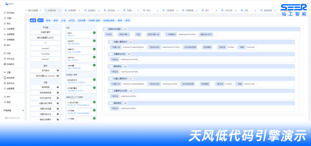 面对复杂的业务需求,RDS 采用「天风低代码引擎+在线脚本定制」,降低了业务开发和操作门槛,理工科毕业生培训两周即可开发出简单的项目。通过天风任务系统,仅需 5 步拖动代码块,即可快速创建一个点对点的运输任务,自主「DIY」,进行业务定制开发。