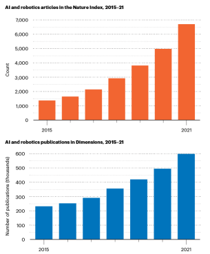 在《自然》指数(Count)中的82种高质量科学期刊上发表的人工智能和机器人学论文的数量一直在逐年上升--速度之快,类似于一条指数增长曲线。正如维度(Dimensions)研究出版物数据库的数据所显示的那样,在未列入《自然》索引的期刊和论文集中也出现了类似的增长。