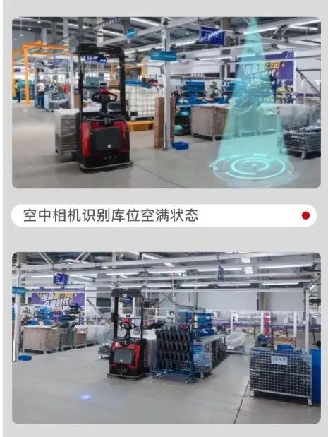 科钛自主识别物料转运方案,主要是由通过物流专用机器人、调度系统、高空相机识别系统等组成,不仅能自主识别库位的空满状态,实现人机同场混合作业,还能实现每秒2.7米的速度进行高速转运物料,大幅提升搬运效率。