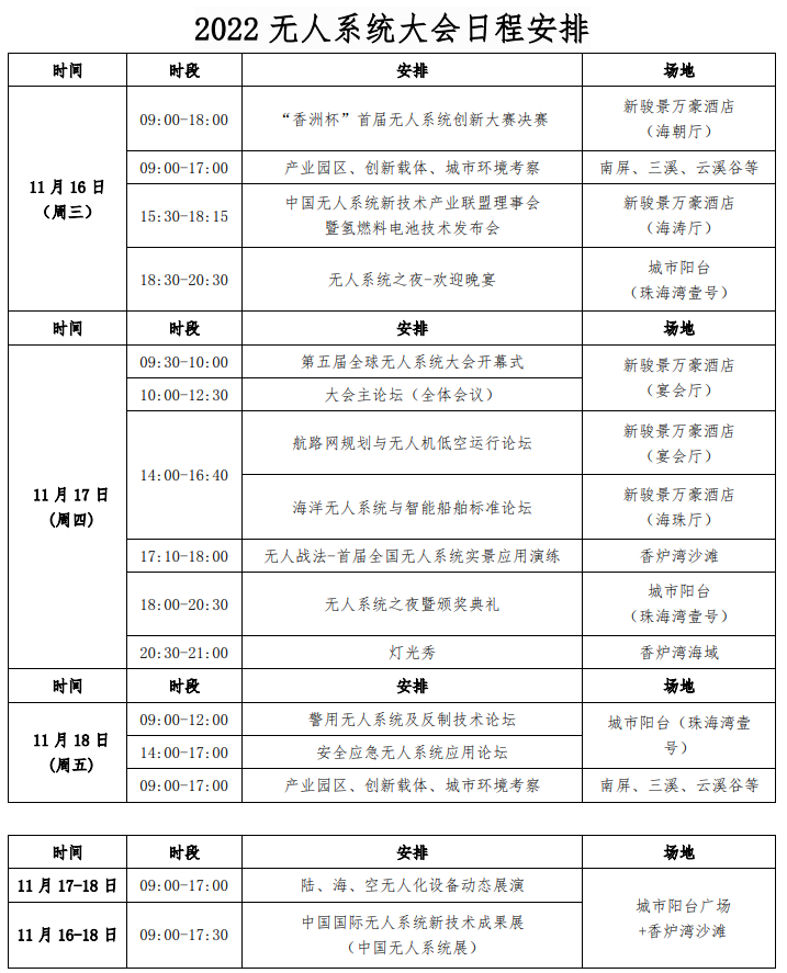 【无人系统网特讯】2022第五届全球无人系统大会11月16日-18日再次与您相约美丽的滨海城市珠海!大会由中国航空学会、中国科学院地理科学与资源研究所、珠海市香洲区人民政府、中国无人系统新技术产业联盟联合主办、全面升级,倾力打造“无人战法-首届全国无人系统实景应用演练”、“中国国际无人系统新技术成果展”、“香洲杯-无人系统创新大赛”、“全球无人系统之夜”等系列活动,助推产业项目快速落地,享亿元产业政策支持机会。