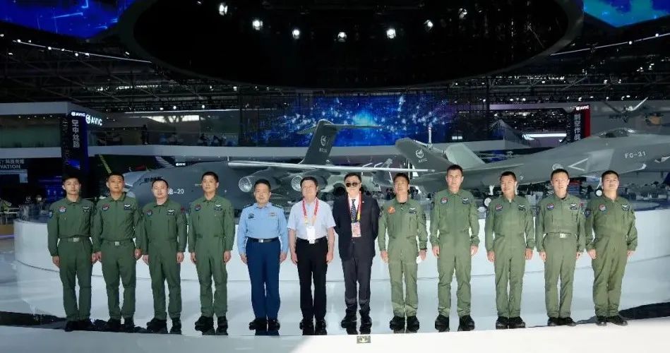 航空工业党组副书记李清堂、航空工业新闻发言人周国强、空军新闻发言人申进科大校与参加第十四届中国航展的运油20、歼20、歼16、轰6 K、空警500A、教10、攻击2、八一飞行表演队、红鹰飞行表演队的9名飞行员在航空工业展台合影