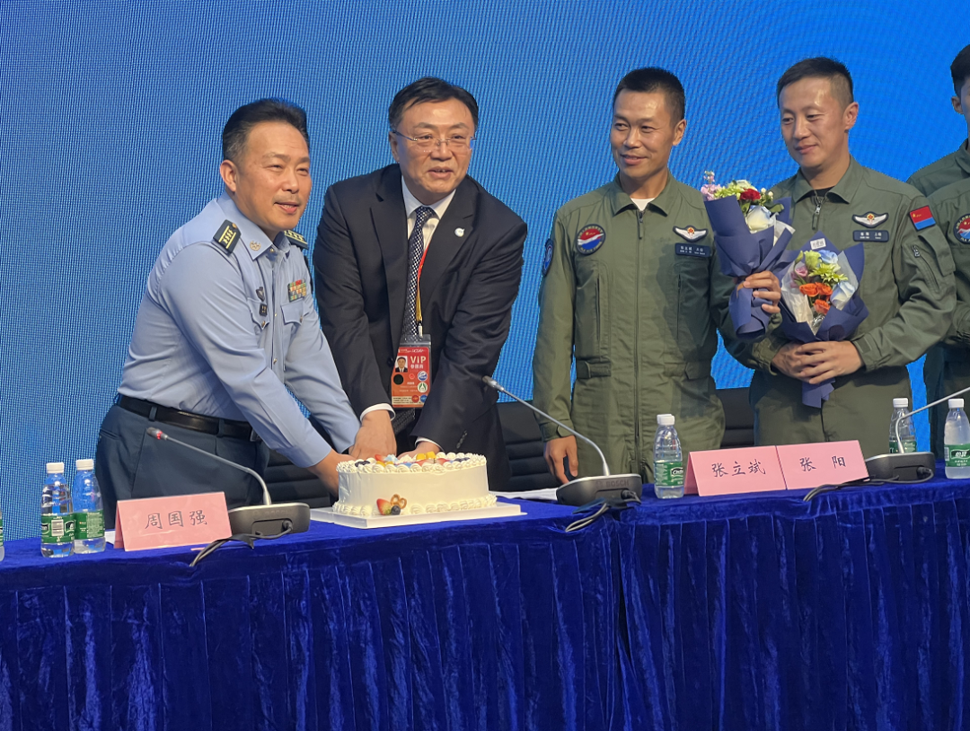 活动尾声,周国强受航空工业党组委托,带着40万航空人的崇高敬意与美好祝愿,为即将迎来73周岁的人民空军送上生日蛋糕,航空工业青年员工代表向9位飞行员献上鲜花,祝福飞行员们起落平安,人民空军航程壮丽,祖国航空事业高飞远航。