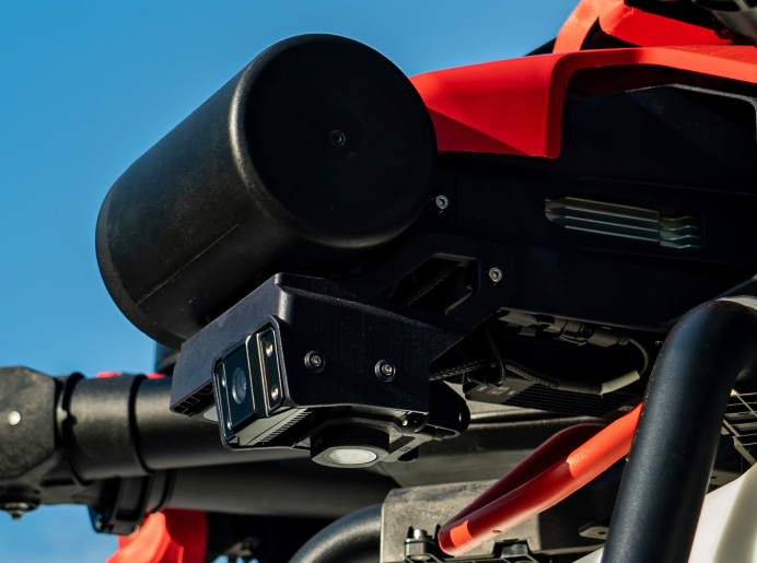 极飞 2023 款农业无人飞机前部安装了两个摄像头,一个向前,一个向下,让你可以在遥控无人飞机时,能及时地了解无人飞机前方的农田环境,和识别机身下方的准确位置,这是飞行圈地的基础。你只需把手机连接到双手遥控器上,打开极飞农服 App,新建一个地块,就能进行飞行圈地打点、自动规划航线,轻松搞定大地块航前测绘。当然,你也还是可以直接加装标配的 RTK 模块,进行人工圈地打点。
