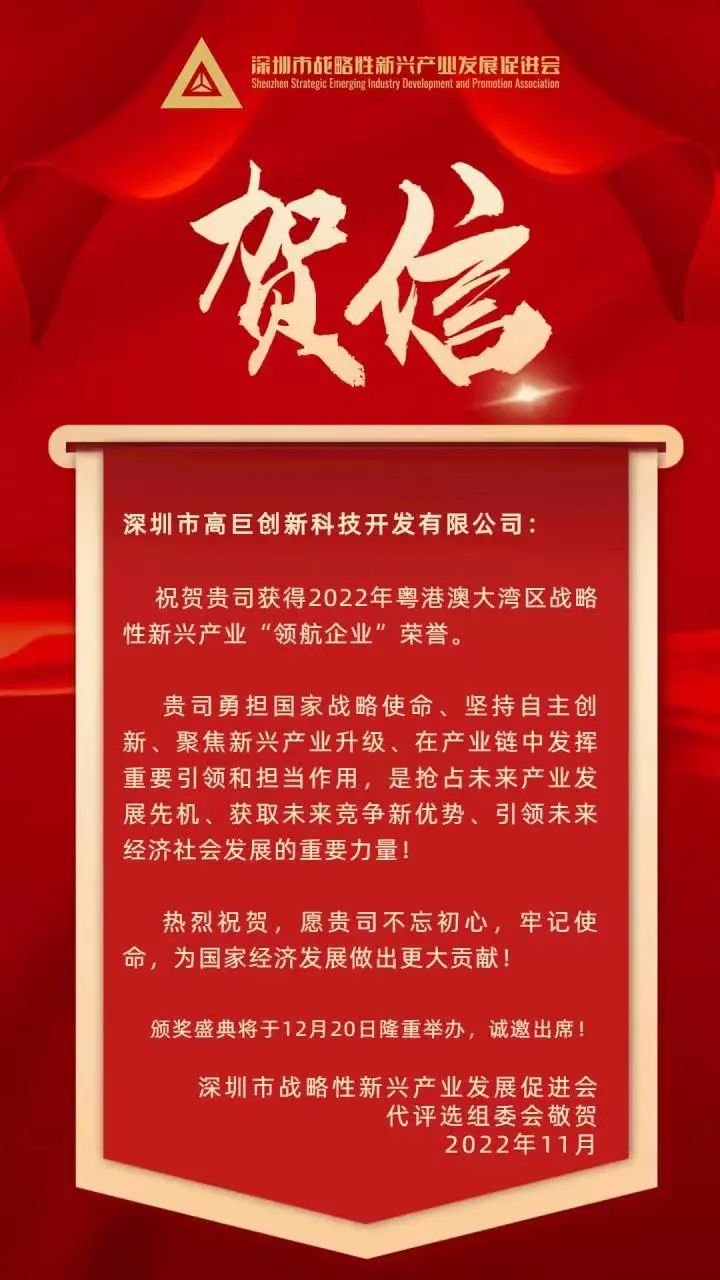 2022年11月14日,“2022年粤港澳大湾区战略性新兴产业领航企业暨第二届粤港澳大湾区战略性新兴产业‘拓荒人物’、‘青年领袖’评选”结果揭晓。高巨创新凭借卓越的创新能力、转化能力和产业链能力,荣膺“2022年粤港澳大湾区战略性新兴产业领航企业”。
