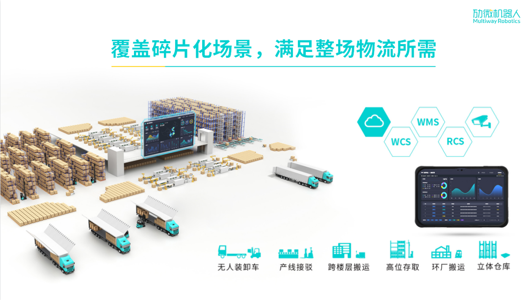 领先的场内智能物流解决方案提供商,劢微机器人软硬件一体化交付平台,从物料的平面搬运、上下线、拆码垛、高位存取到无人装卸多场景高效作业,灵活对接上下游设备,满足整场智能物流所需。
