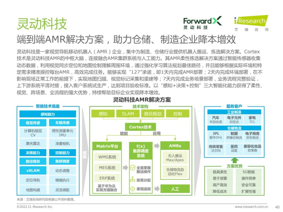 目前国内仓储、制造业领域的数字化转型已经步入深水区,采用机器人来实现『降本增效』已经成为一种行业共识。而随着全球范围疫情持续反复、外部环境愈发复杂,逆全球化态势上扬,一些需要大力依靠人工作业的传统产业,通过机器人来打造自动化的仓储物流以及高效人机协作制造体系的需求已经相当迫切。艾瑞咨询认为:『相较于人工,机器人在生产效率、质量、工作稳定性、环境依赖性等多个方面具有固有优势。特别是在完成高精度、耗时长、环境恶劣等工作时,机器人可有效提升生产效率,统一产品质量,并且保障人身安全。企业尤其是制造业的智能转型升级,使机器人在工业领域具备成熟应用体系。』在灵动科技看来,使用 AMR 对固有的协作体系、工作流程进行优化,并非只是将 AMR 当做『从 A 送到 B』的自动化搬运工具。基于『感知+决策+控制』的三大智能化能力,灵动科技 AMR 在柔性、视觉、跨场景、全流程等场景下拥有巨大优势。企业能够将灵动科技 AMR 机器提供的解决方案完美融入到已有的仓储、供应链等工作体系或管理流程中,而无需对流程本身做出过多更改。