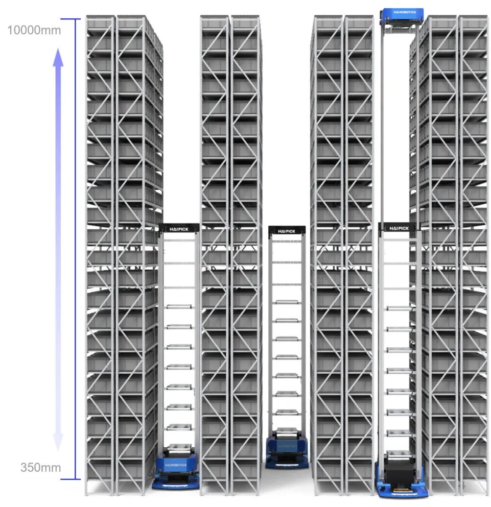 海柔创新伸缩升降料箱机器人HAIPICKA42T,进一步突破了ACR(箱式仓储机器人)在普通仓库单层6m内的存储密度,