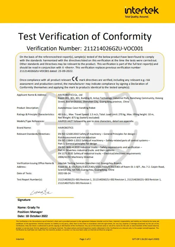 本次获得ETL和CE双证认证的HAIPICK A42T系列伸缩升降料箱机器人从机械安全、功能安全、电气安全、及核心器件安全等多方面进行了安全设计,拥有极高标准的质量保证。