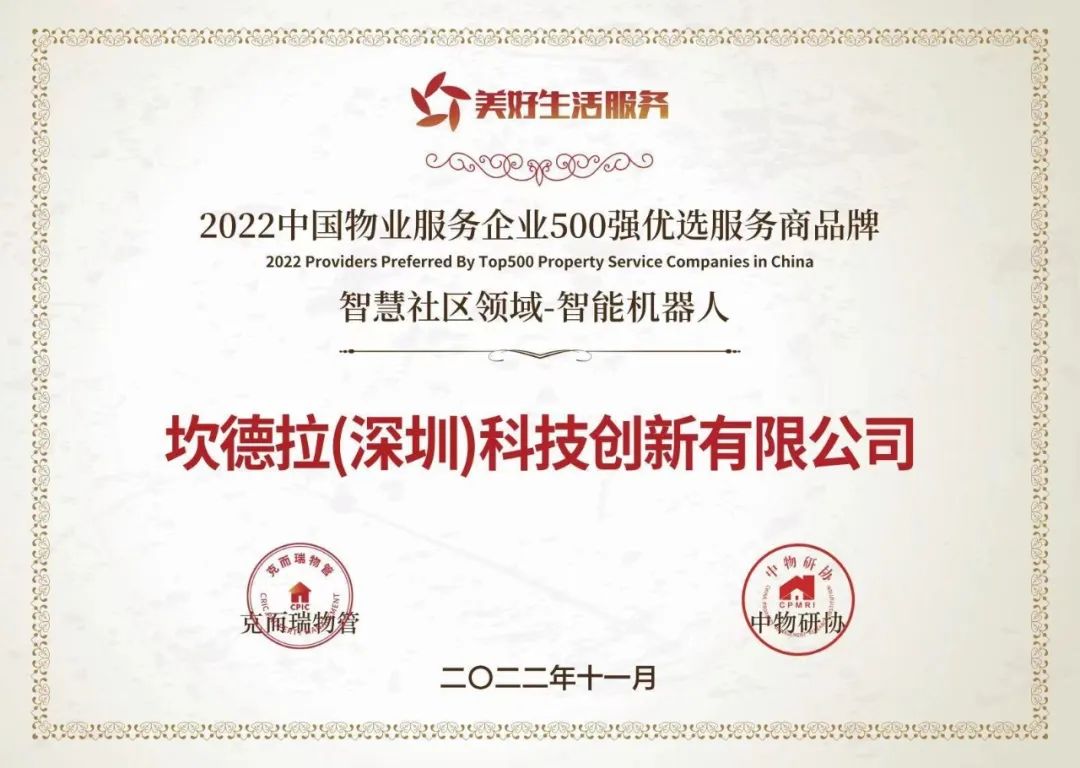 坎德拉凭借在物业行业的出色表现,荣登“2022年中国物业服务企业500强优选服务商品牌”榜单。