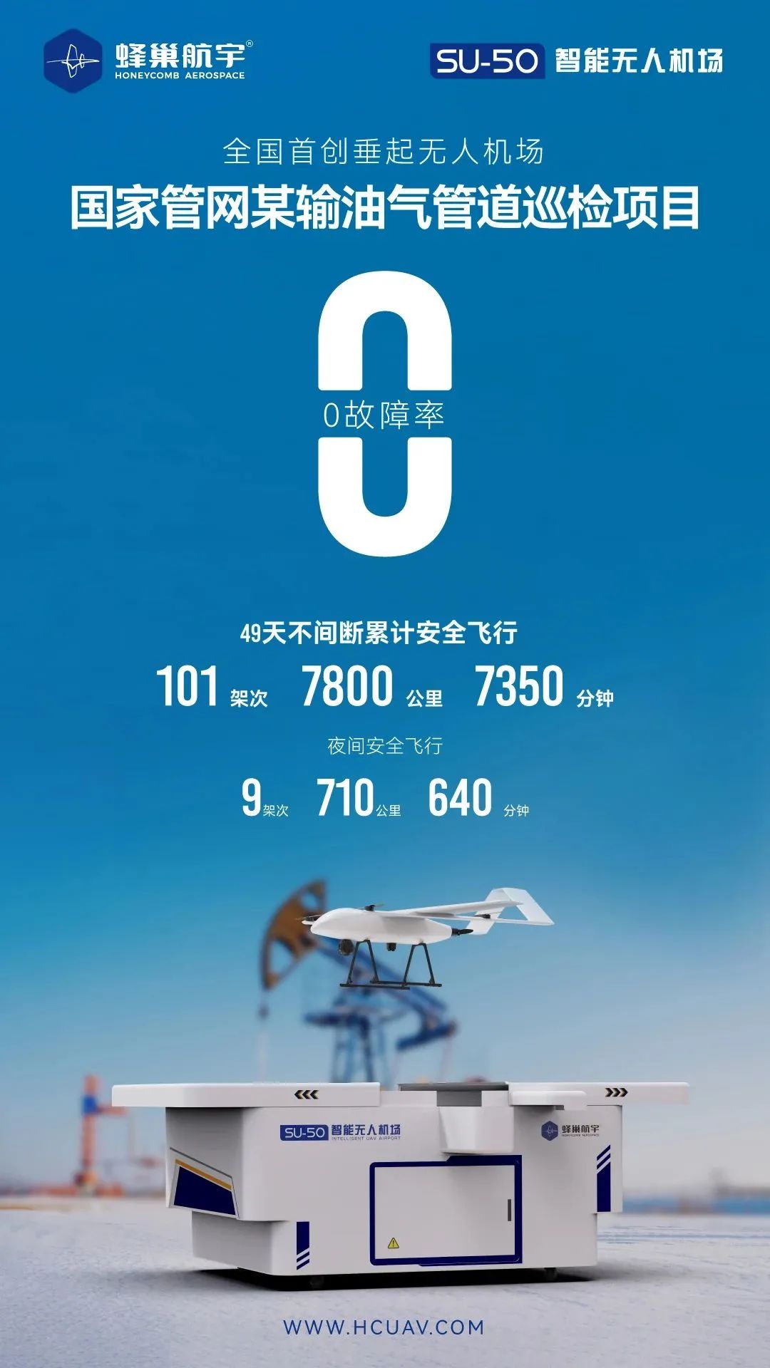 9月,SU-50垂起智能无人机场在新疆成功部署。截止目前已飞行作业101架次,总飞行距离7800公里,总航时7350分钟,其中包括9次夜巡,夜巡总飞行距离710公里,夜巡总航时640分钟(作业仍在进行中, 数据也不断在刷新),实现了高频次、常态化、无人化、零故障的输油气管道自主巡检新模式,在垂起智能无人机场领域,蜂巢航宇占有95%的市场份额。