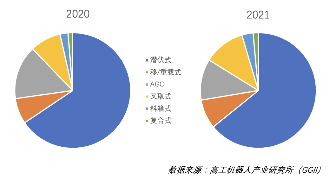2021年,移/重载式、叉取式、料箱式、复合式机器人市场占比均有所上升,其中移/重载式和叉取式占比提升最多,分别由2020年的7.18%、8.67%提升至2021年的8.18%、11.57%。相比下,AGC占比下滑明显,从2020年的15.04%降至11.49%。