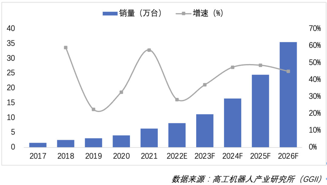 注:1、此处销量以企业出库数量统计计算口径,仅统计国内市场销量,出口销量不在此统计范畴内。2、此处统计未包含巡检机器人类别。