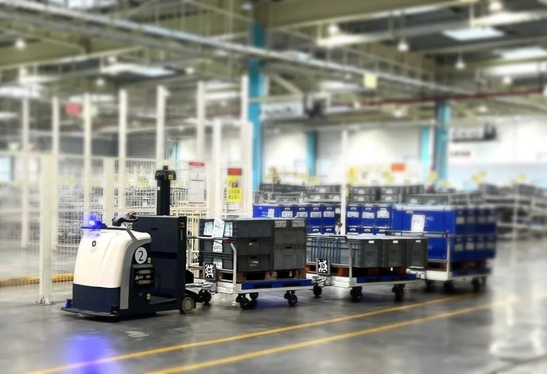 在广汽丰田总装车间内,斯坦德无人牵引车首创性实现AMR与牵引料车的全自动脱钩、挂钩,可完成从线边库准备物料到发料区料车空满置换,最终返回线边库全过程闭环无人化作业,解决了汽车行业总装车间物料配送的最后100米难题。