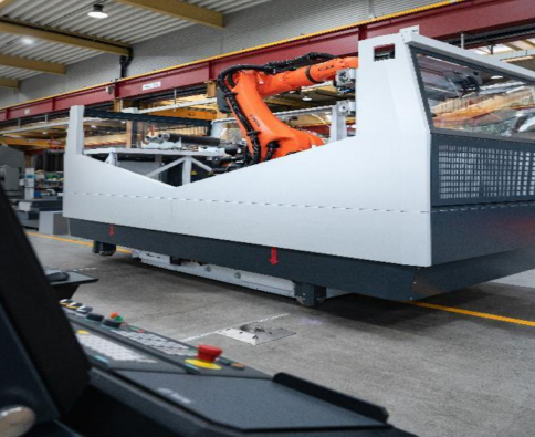 一个大尺寸的自动导引车(AGV),其机器人单元的设计包含了你需要的一切。换句话说,机器人、工件和工具夹持器,以及工件和工具的缓冲位置,还有必要的控制和安全技术。机器可以自由进出。它没有被堵塞或阻挡。