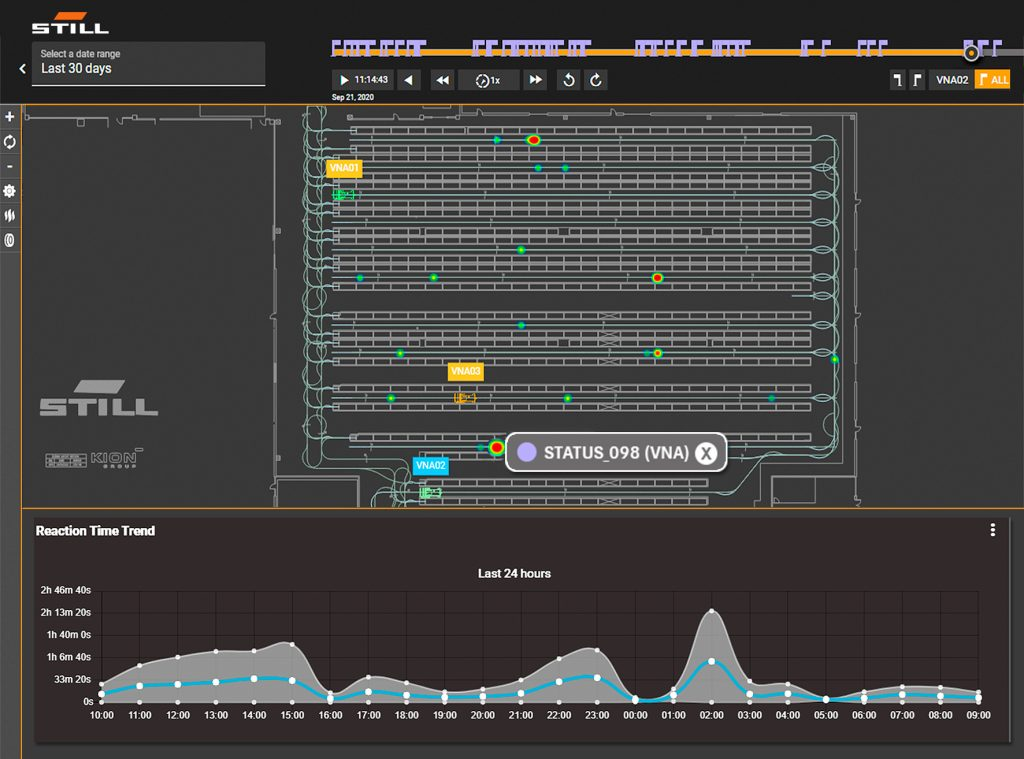 AGV由一个运输和交通控制系统控制和监测。叉车式AGV的订单由SAP主机中的仓库管理系统生成,并传输到控制系统中。大量有用的数据昼夜不停地产生,这些数据被用来对自动化仓库以及微软云中的流程从更高的角度进行全面分析。通过iGo Insights,Still提供了一个评估工具,从云端收集的大量流程信息中过滤出相关信息,并得出具体的行动建议。