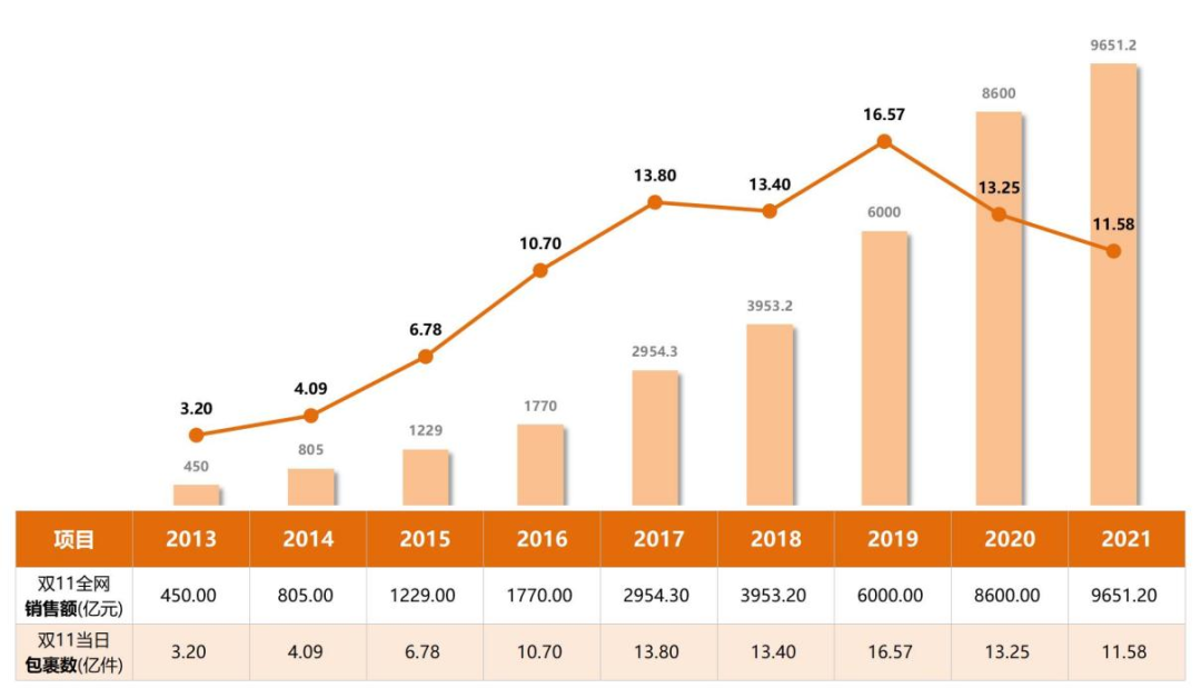 历年双11全网销售额及当日包裹数变化趋势