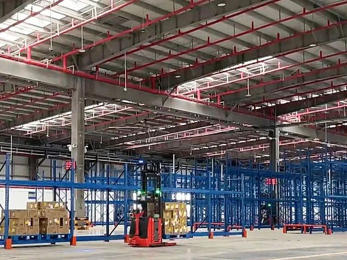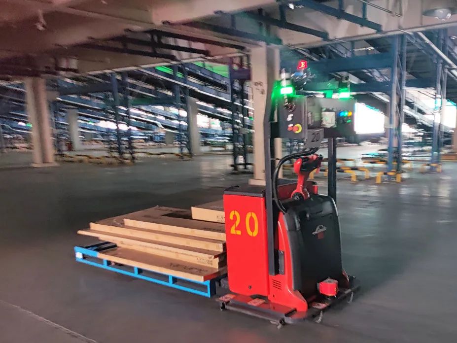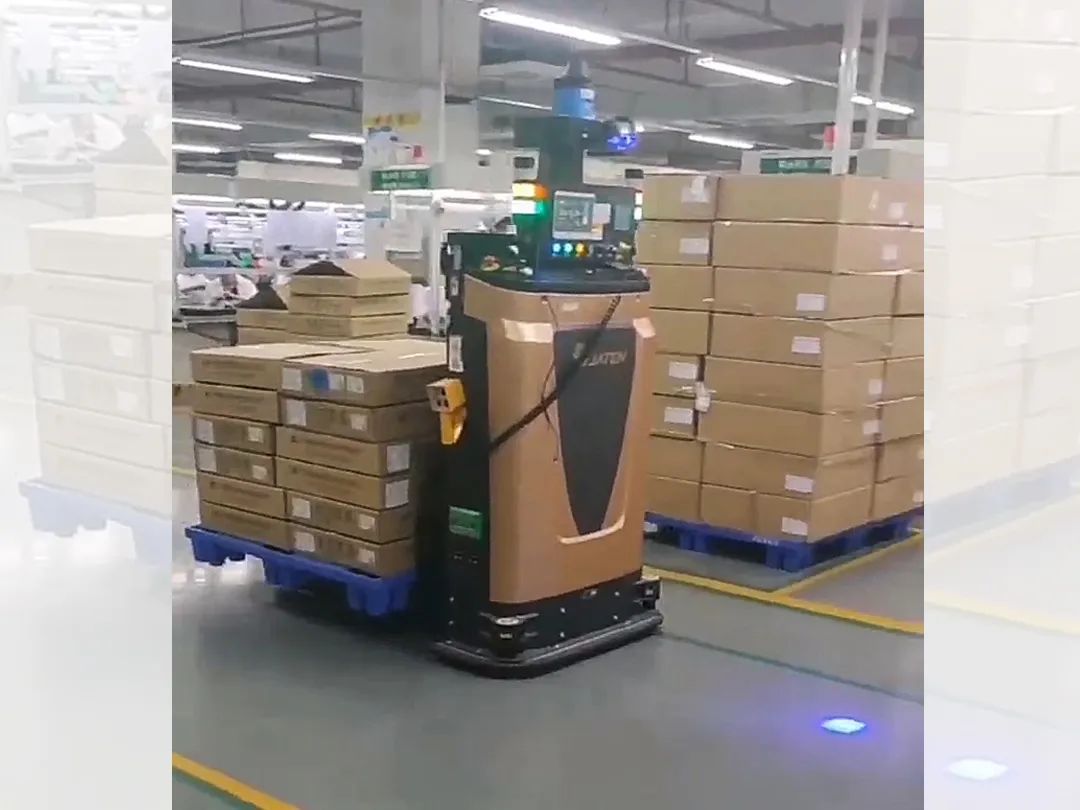 嘉腾为佛山某知名电子企业工厂提供跨厂房、跨楼层长距离的AGV配送智能解决方案,在车间内部通道窄小,楼面承载力低的车间里,选配嘉腾超窄通道堆垛车LN1400-MB1425-JTS,还能自动进出电梯和自动门,完成成品托盘无人搬运任务,实现智能物流升级。