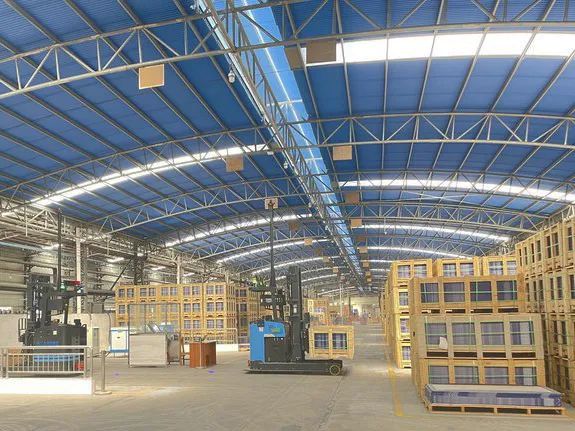 佛山知名陶瓷企业工厂仓库存放多种规格瓷砖,收发频繁、批量大,采用前移式叉车LN3000-MF3530和智能调度系统,完成自动存取出入库。