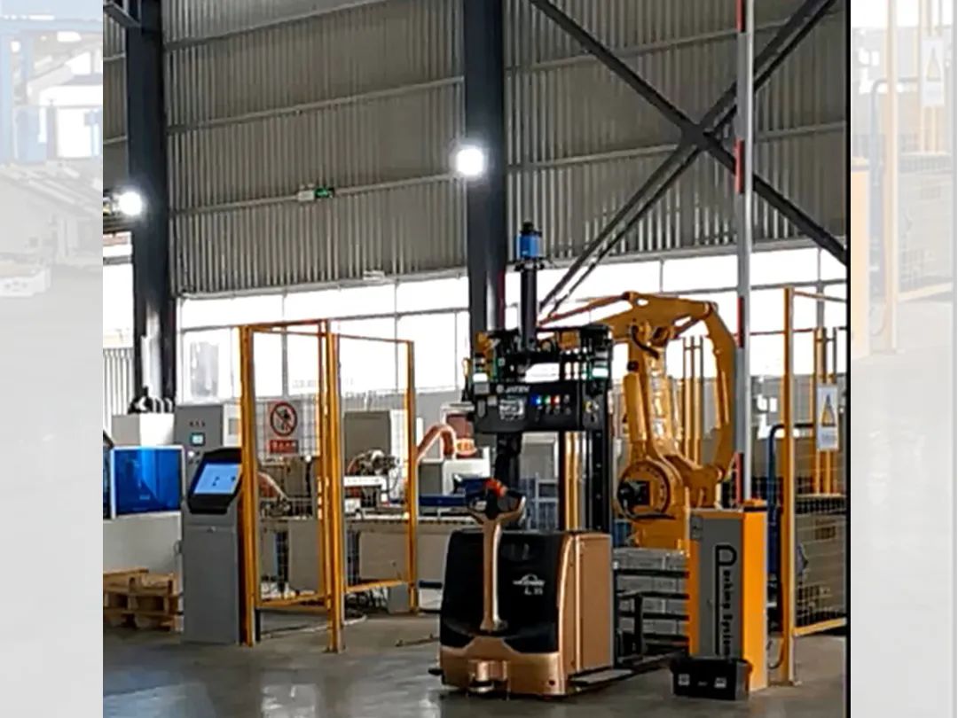 江西知名有色金属企业全自动磷铜球生产车间内,托盘堆高车LN1600-L16与机械手进行信号交互,机械手码垛完成后,通过远程MFIO模块传递信号给AGV系统,确保了成品下料和叉车AGV取料的安全性。