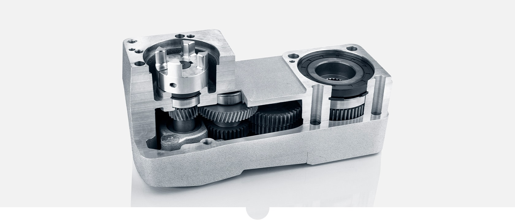 基于GSC Schwörer在设计和制造行星齿轮箱方面的多年经验,第一个原型很快被创造出来。我们没有采用通常的两级解决方案,而是选择了一级高齿比的单级解决方案。仅此一项就使每个驱动器的长度减少了30毫米。花键电机轴的使用补充了实现短小设计的努力。最后,优化的输出使其有可能保持所需的总长度。两个简单的、具有成本效益和坚固的球轴承吸收了高的径向力。齿轮的油脂润滑可以防止不必要的泄漏,并确保较长的使用寿命。