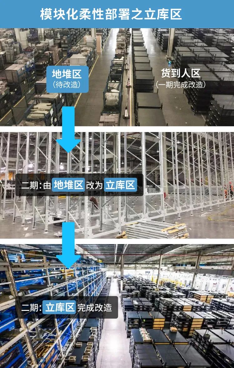 ▲ 极智嘉通过模块化柔性部署,对现场进行分期实施、分区上线