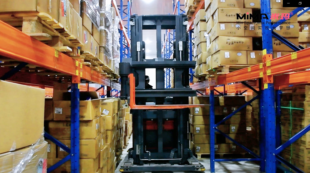 1、MiMA三向叉车作业净通道宽度仅为1.6米,仓库面积相同、堆垛高度同为6米的前提下,库容量提升50%;