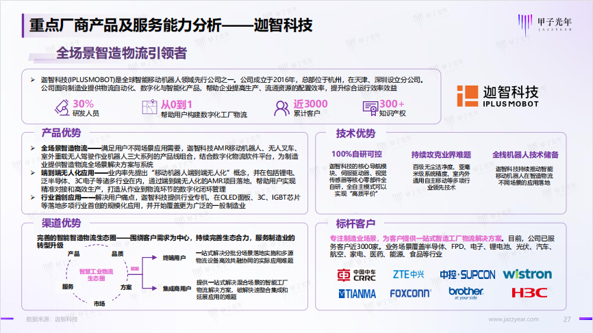 日前,国内知名科技产业智库——甲子光年重磅发布了《制造业企业物流“智”动化》报告(以下简称《报告》)。迦智科技凭借突出的技术实力和产品力、成熟的解决方案和落地应用经验,成功入选报告代表厂商。