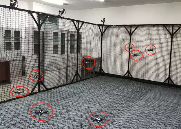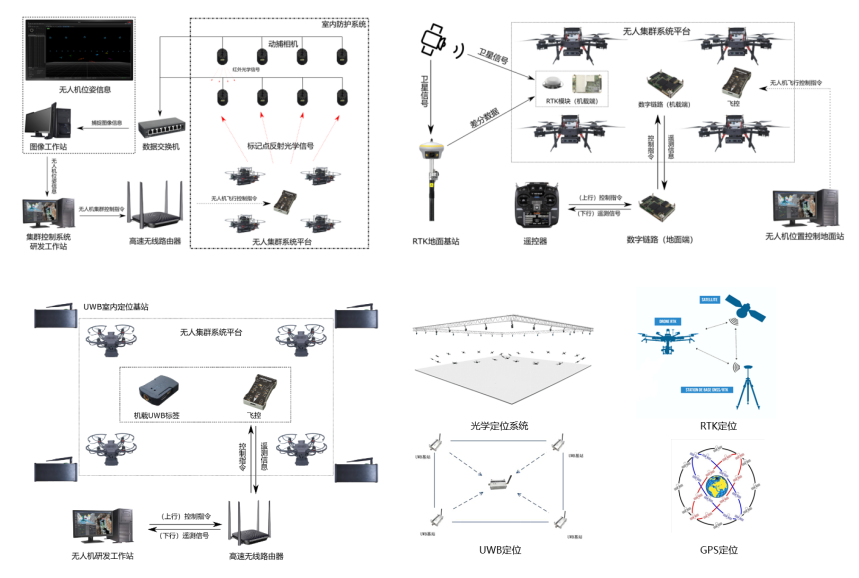 集群实飞平台可以在多种定位系统环境下(光学定位、UWB 定位、RTK 定位等)实现无人系统集群控制。本平台支持集群通信技术,在统一控制接口下实现无人载具的按照规划路线运动,验证多机、多车编队和协同控制等算法的有效性。