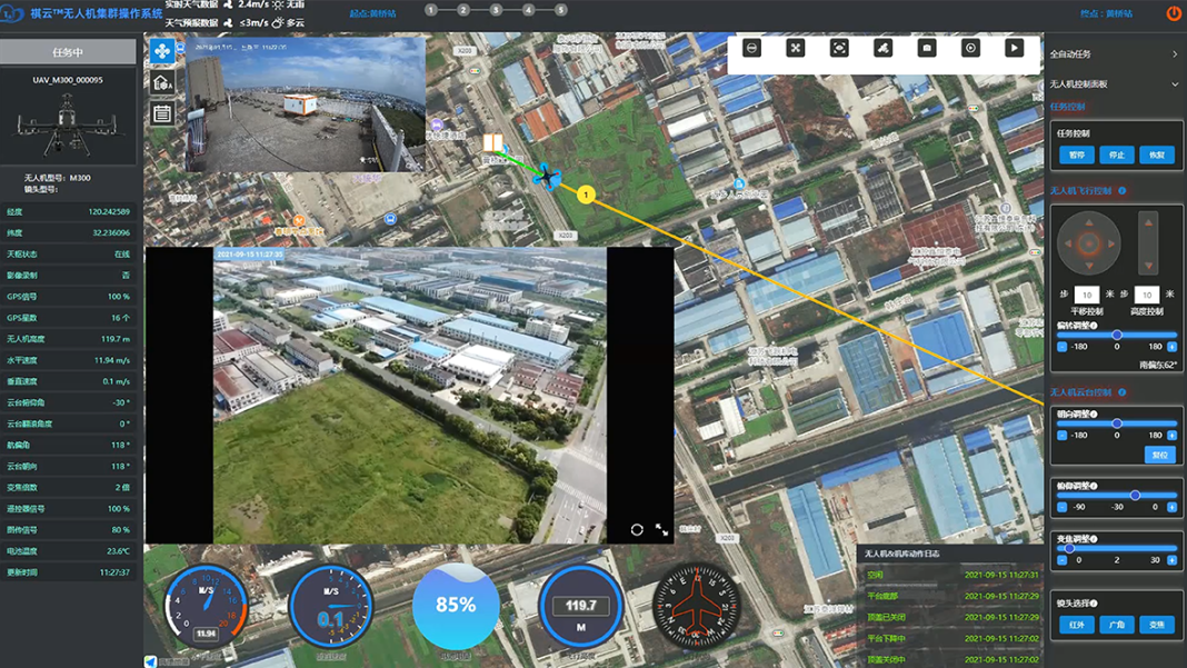 在无人机巡检开始前,用户通过远程控制系统为无人机下发巡检任务,待无人机接收任务后从机库起飞,巡检过程中可完成航线规划、一键起飞、远程调度等指令,对目标区域进行常态化运维巡检,通过无人机高清视频流的低时延推送,供后台管理人员进行实时观察。