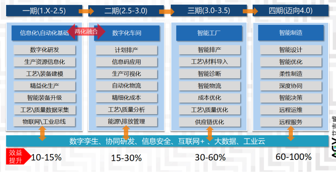 艾吉威规划当前我国智能制造工厂实施阶段分解: